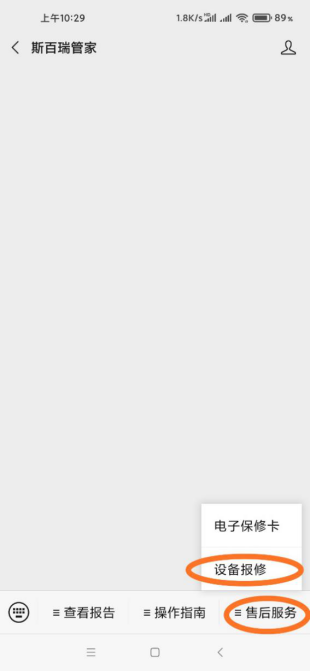 1. 首先打開(kāi)手機(jī)微信在添加公眾“斯百瑞管家” ,點(diǎn)擊關(guān)注后,點(diǎn)擊售后服務(wù)菜單,選擇設(shè)備報(bào)修(如圖一),
