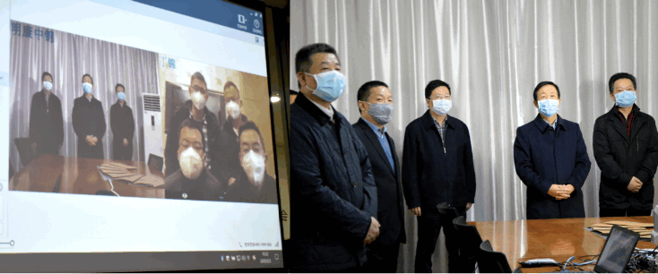 ▲ 許達哲(右二)通過視頻連線向明康中錦派往武漢的工程技術(shù)團隊致以慰問。