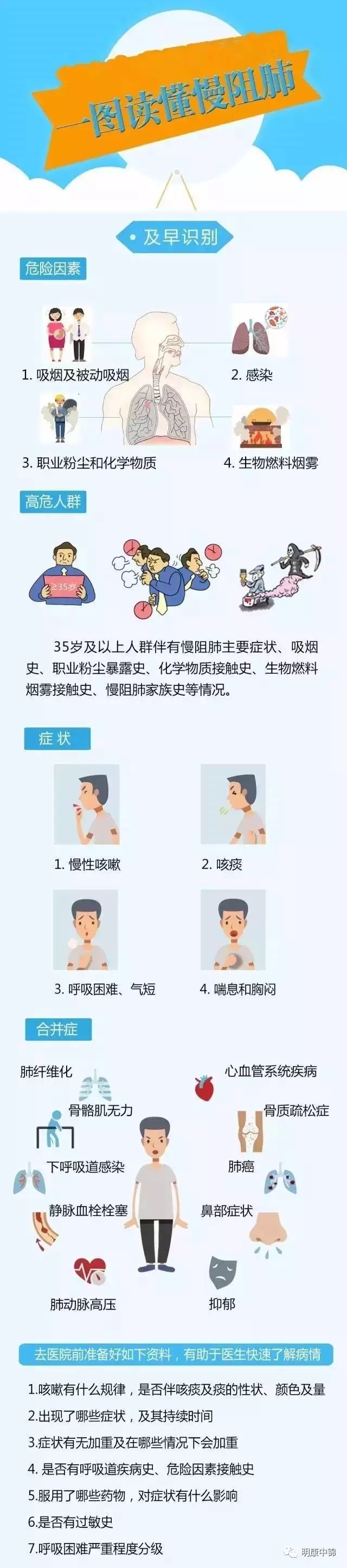 3、慢阻肺早期幾乎沒有癥狀,人們對疾病警惕性不高,長期忽略甚至忽視治療,如出現(xiàn)長時間咳嗽、氣短必須及時就醫(yī)。